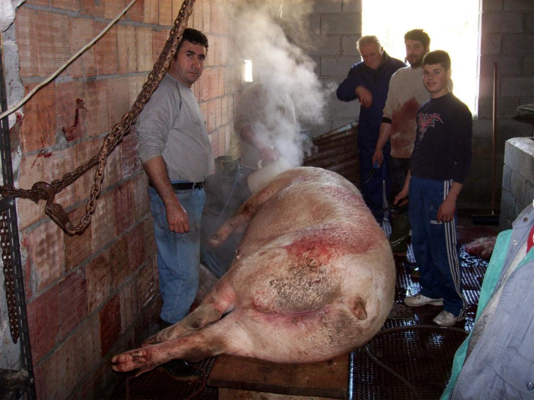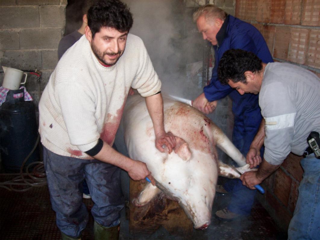 MACELLAZIONE PRESSO L'ALLEVAMENTO DI MEO CARMELO In questi giorni di festività natalizie siamo stati ospiti di Carmelo Meo per fotografare le varie sequenze della macellazione dei maiali. L'anno scorso abbiamo pubblicato le foto della lavorazione della carne, il taglio dei capocolli, la preparazione della carne macinata per i salumi ed abbiamo pubblicato anche le varie fasi delle frittole. Quest'anno invece pubblichiamo le fasi della "scannatura", una foto è stata leggermente modificata perchè troppo cruenta, della pelatura e della divisione in due "minzine" e lo sfilamento delle budella. Ringraziamo Carmelo per la sua cordialità e speriamo di aver fatto tornare alla mente cosa succedeva a Fossato il giorno di Santo Stefano. Clicca sulle foto per ingrandirle